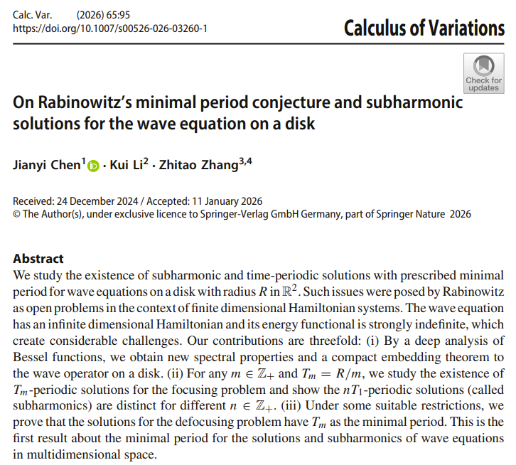 二维圆盘上非线性波动方程的最小周期解(张志涛与合作者)