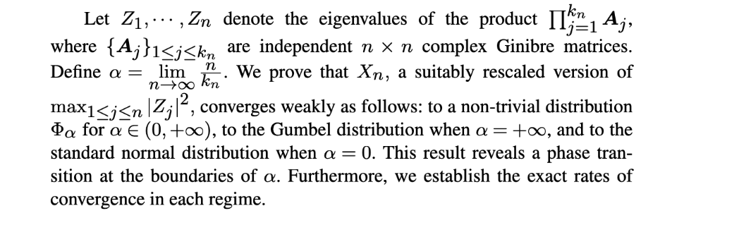 报告题目:Phase transition and convergence rate of spectral radius of product of complex Ginibre