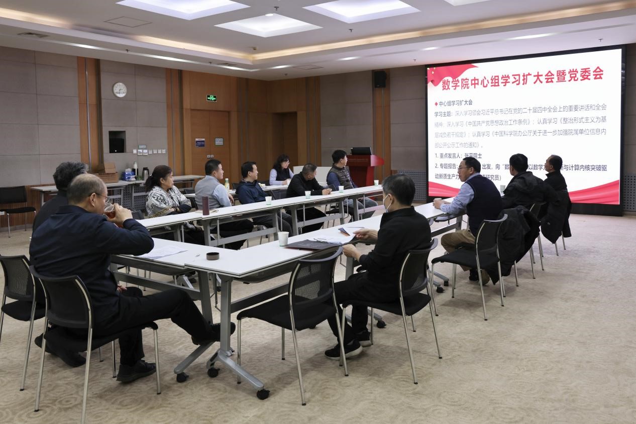 2025年11月26日下午,中国科学院数学与系统科学研究院(以下简称“数学院”)召开中心组学习扩大会。学习主题是深入学习领会习近平总书记在党的二十届四中全会上的重要讲话和全会精神;深入学习《中国共产党思想政治工作条例》;认真学习《整治形式主义为基层减负若干规定》;认真学习《中国科学院办公厅关于进一步加强院属单位信息内部公开公示工作的通知》等。数学院院所领导、党委委员参加了会议,会议由党委书记兼副院长武艰主持。